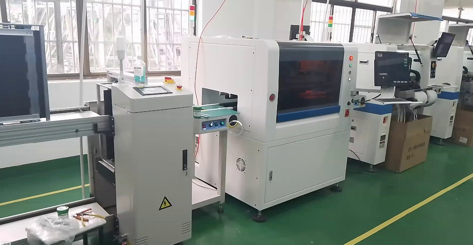 半自動印刷機(jī)搭配全自動上板機(jī)加六頭飛拍貼片